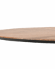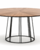 The ultra thin tabletop becomes a surface rich in craftsmanship and detail. Carefully arranged triangular veneer pieces radiate toward the center like slices of a circle, forming a refined sunburst pattern that highlights the natural direction of the wood grain. This complex technique creates subtle variations of light and texture across the surface, turning the top into a strong visual feature. Beneath it, the airy metal base, composed of two rings connected by slender vertical rods, forms a hollow conical structure that maintains stability while preserving a light and elegant appearance.