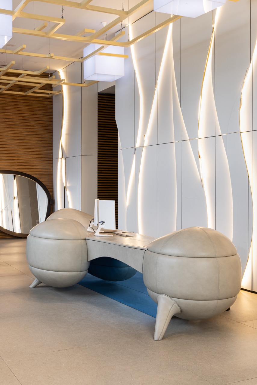 At the center stands a sculptural reception desk that almost looks like an AI generated image gone wrong, except it is not a mistake, and it was designed even before the AI era. Guy conceived a composition of inflated, upholstered spheres, almost like a soft sofa transformed into a reception desk. The entire piece is clad in rich grey leather, with a leather work surface, blue mirrored fronts, and a rounded, padded body that draws attention from every angle. Behind it rises a dramatic wave wall with concealed lighting. Above, a precise ceiling of brass strips and oversized light cubes. To the side, an L shaped wall with linear lighting against a gold backdrop. Near the elevators, a tall vertical wood slat wall continues the material language. Every element was custom made by Niso according to Guy’s vision, requiring solutions rarely encountered in conventional projects.