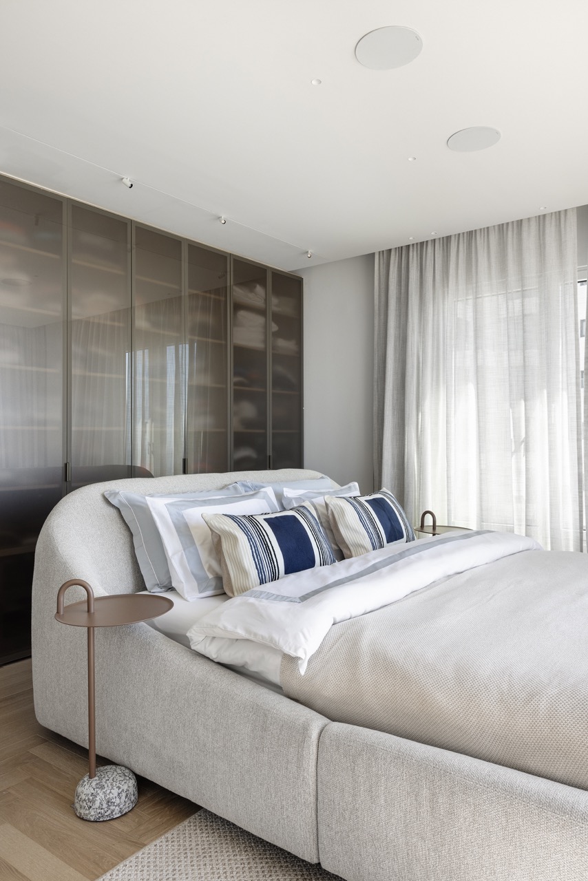 חדר השינה, פנינה נוספת בתכנון של גלאטיה, מביט היישר אל הים דרך חלון ענק שמביא את כל הים התיכון פנימה. במרכזו ניצבת מיטת דובה בעיצוב מעוגל ורך, עשויה בד אריג פרקטי בהיר. המיטה, שאינה צמודה לקיר, חושפת בגאווה את גבה המעוגל, בעוד שמאחוריה מתגלה ארון בגוון בז׳ עם דלתות חצי שקופות, יצירת אמנות פונקציונלית שמתכתבת עם שאר חללי הבית. הפרקטיות משתלבת כאן עם יופי טהור – המעבר הנוח מאחורי המיטה והארון מוסיף שכבה של שימושיות לצד עיצוב בלתי מתפשר. כפיר גלאטיה אזולאי הצליח לזקק מכל אלמנט את המיטב, ולהפוך את הפנטהאוז הזה למקום שבו נוחות, יוקרה ותכנון מבריק נפגשים בהרמוניה מושלמת.