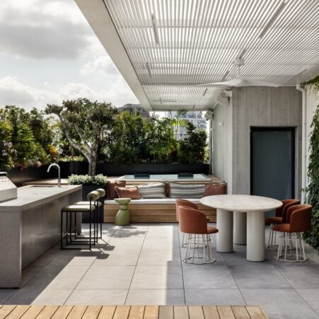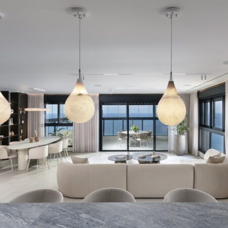 לב הבית הוא שולחן האוכל, יצירה חד־פעמית ומורכבת במיוחד. שולחן פייט באורך 360 ס״מ, עם משטח זכוכית חומה שנחתך בקובץ ייעודי והונח על מסגרת מתכת פיסולית וצבועה. האתגר ההנדסי של עבודה עם זכוכית באורך כזה הוליד פתרון אפילו חזק ויפה יותר מהתכנון המקורי. סביבו כסאות ליז עם ידיות, בבר בר דובה, ובסלון ספת ענבל, כורסאת לוטוס ושולחנות מקרון עם חלוקי הנחל האייקוניים. זהו בית שבו כל פרט עבר מחשבה עמוקה, תכנון מדויק וידיים טובות, והתוצאה היא חלל מרשים, חם ונכון, כזה שנשאר רלוונטי לאורך זמן.
